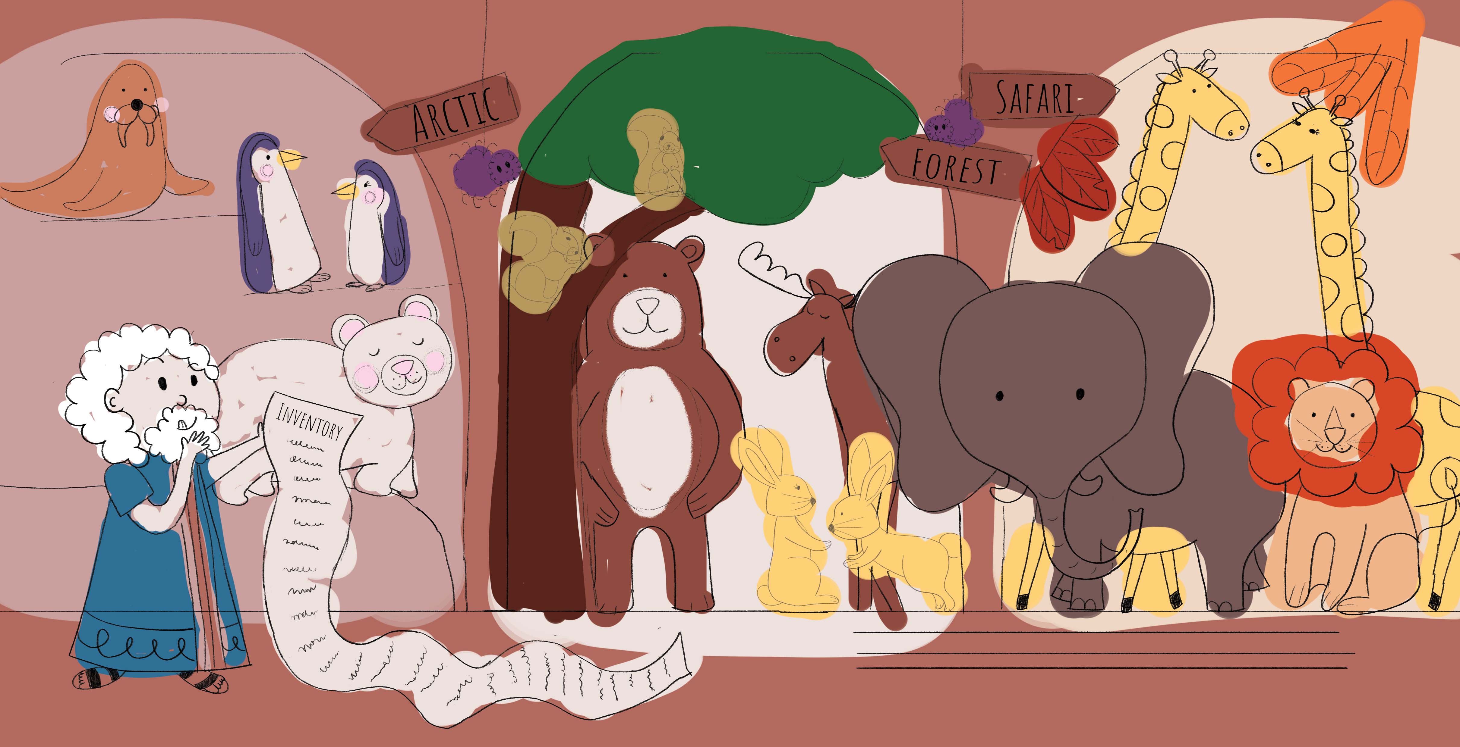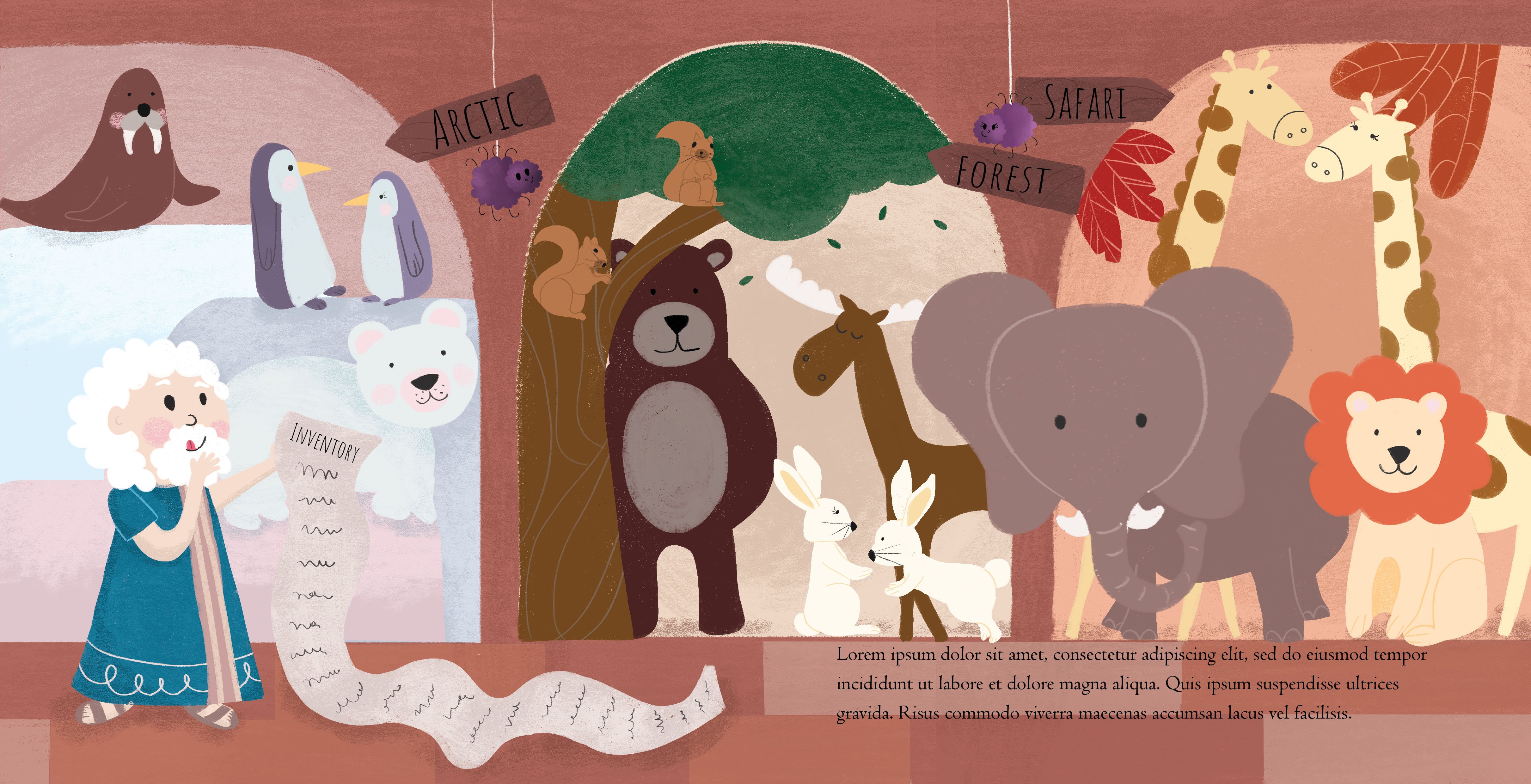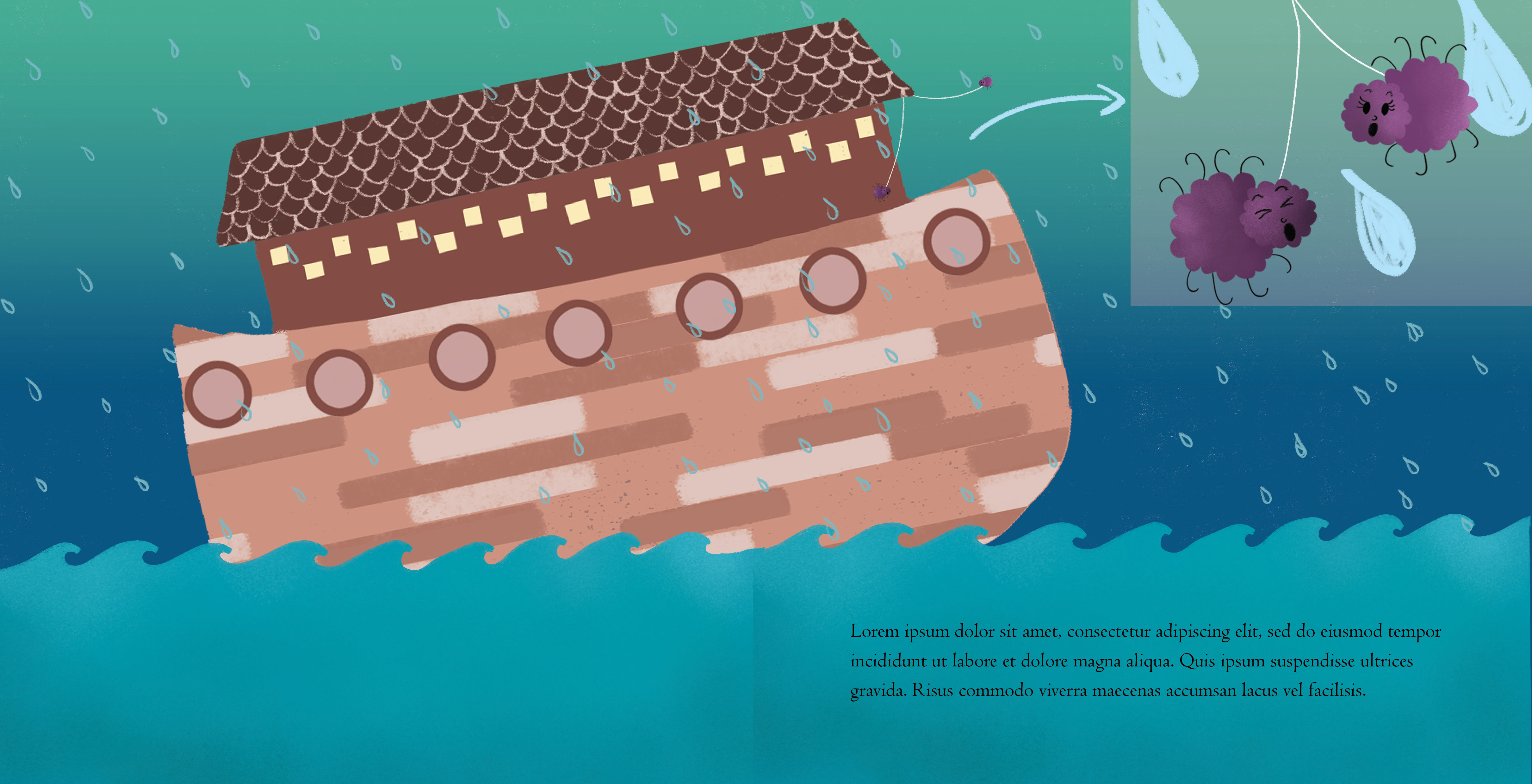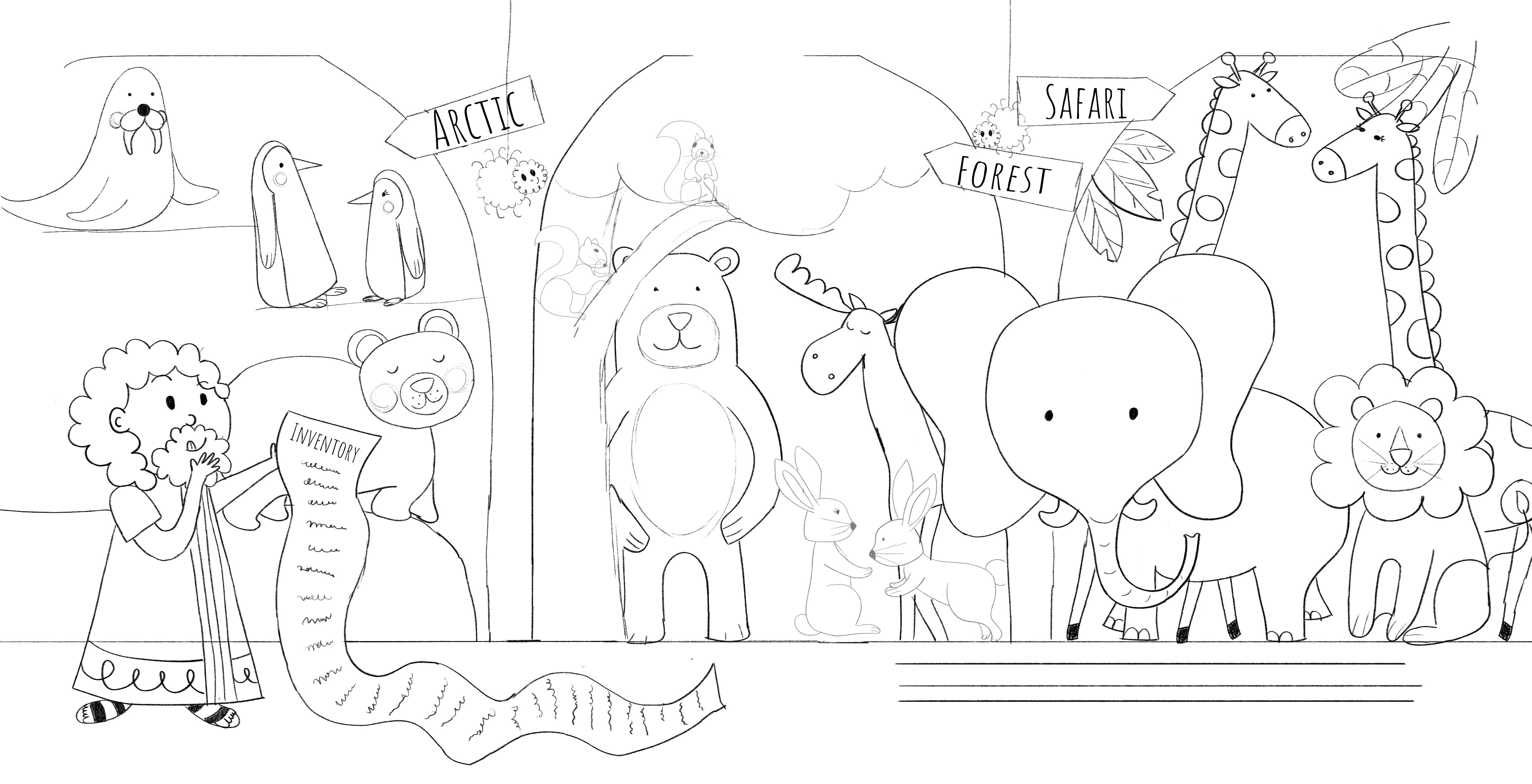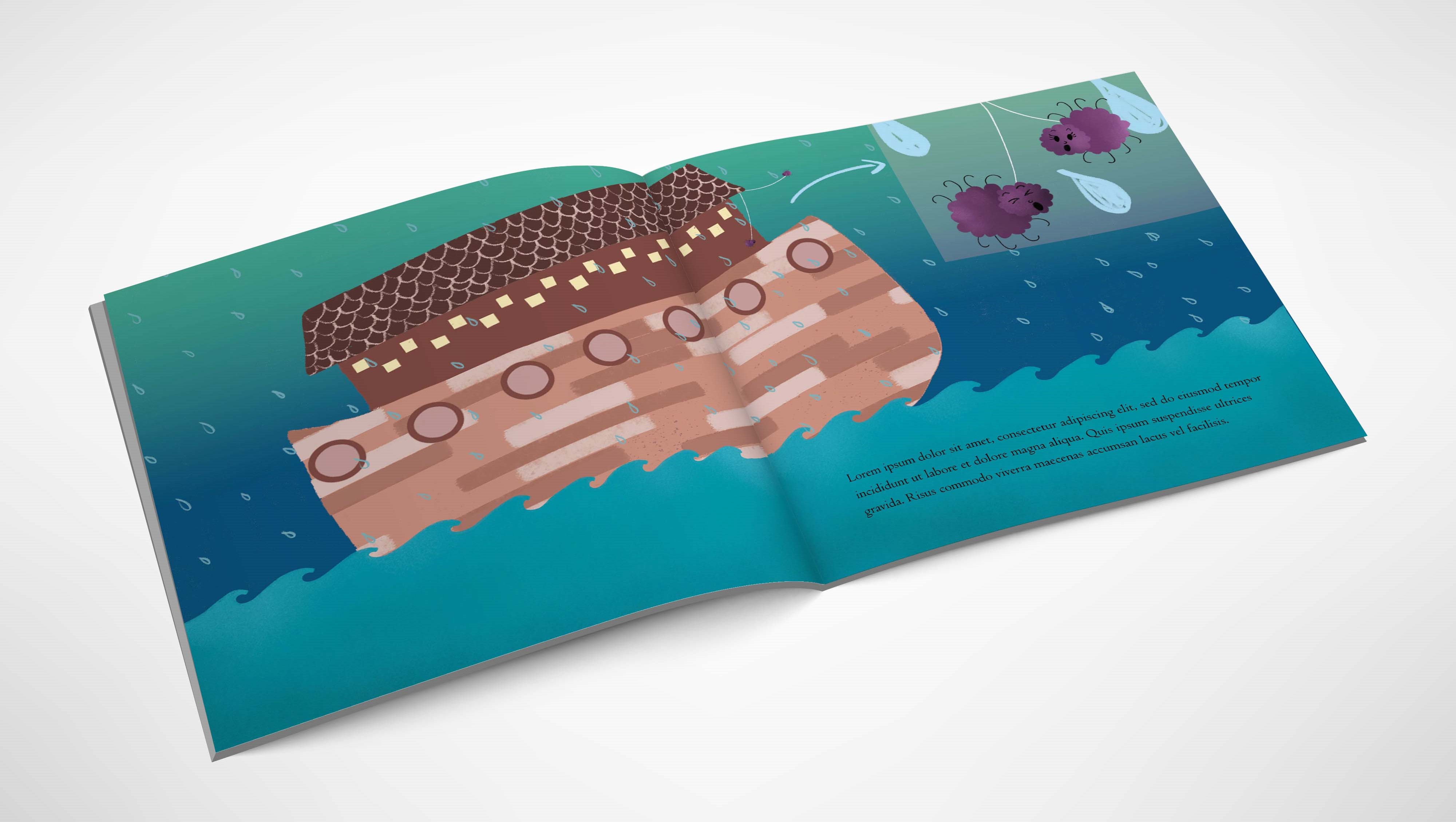 This project involved designing a book cover and two interior spreads. I reinterpreted the tale of Noah’s Ark from a fresh perspective using both rough sketches and refined illustrations.
